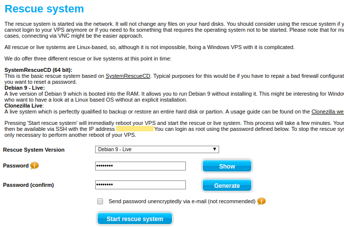 First, boot VPS with Debian 9 live on Rescue system select page. Enter booted OS by VNC and open terminal